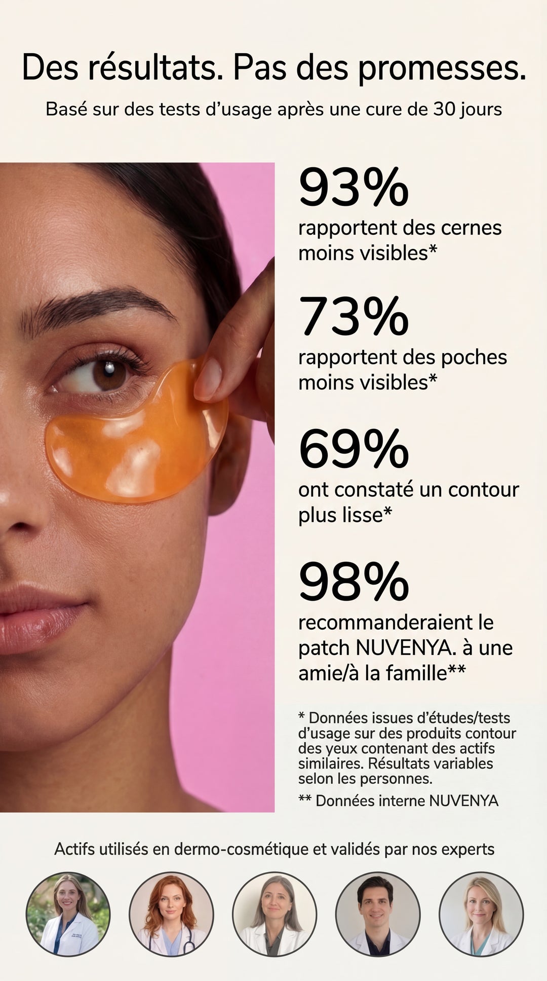 Le matin, j’avais des poches sous les yeux, un regard gonflé, et cette impression d’avoir toujours l’air “à côté de mes pompes". J’ai fait une cure d’un mois avec les patchs Nuvenya, et la différence est nette : le contour de l’œil est plus lisse, mieux hydraté, et surtout mes poches sont visiblement dégonflées.